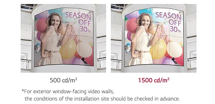Các màn hình ghép khác không thể hiển thị đủ nội dung do khả năng hiển thị thấp dưới ánh sáng chói. Với độ sáng cao 1.500 cd/m², màn hình ghép 55VX1D cung cấp quảng cáo rõ ràng dưới ánh đèn sáng nhất.