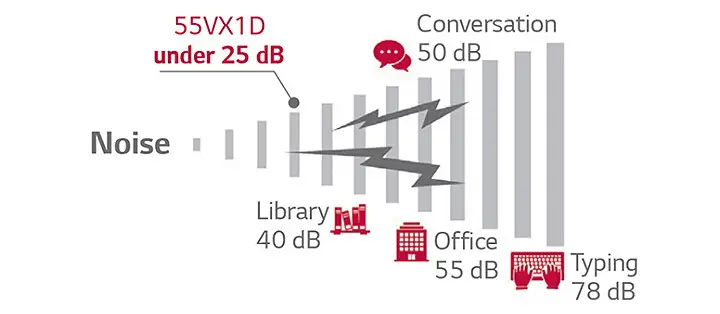 55VX1D là sự lựa chọn hoàn hảo cho môi trường trong phòng điều hòa do việc loại bỏ quạt làm mát. Độ ồn hoạt động của nó dưới 25 dB, yên tĩnh hơn so với một phòng thu âm (30 dB).
