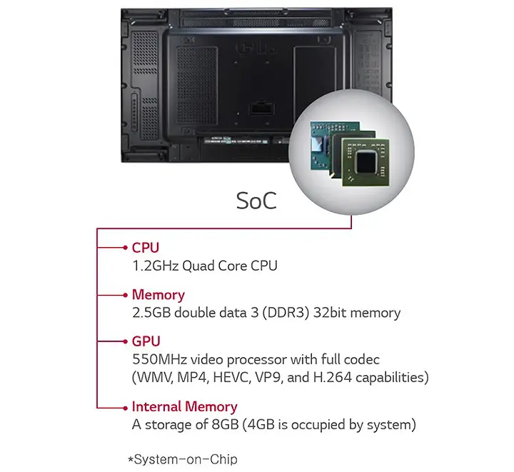 SoC 4 lõi tích hợp được tối ưu hóa trong 55VX1D có thể phát nhiều định dạng nội dung khác nhau và loại bỏ sự cần thiết của trình phát đa phương tiện bên ngoài. Sử dụng SoC tích hợp, mỗi màn hình sẽ phát video của nó mà không có độ trễ để phát lại nội dung được đồng bộ hóa.